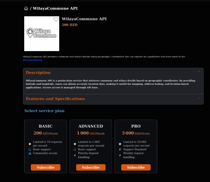 Click on WilayaCommune API to see the details. Then choose a pricing plan
