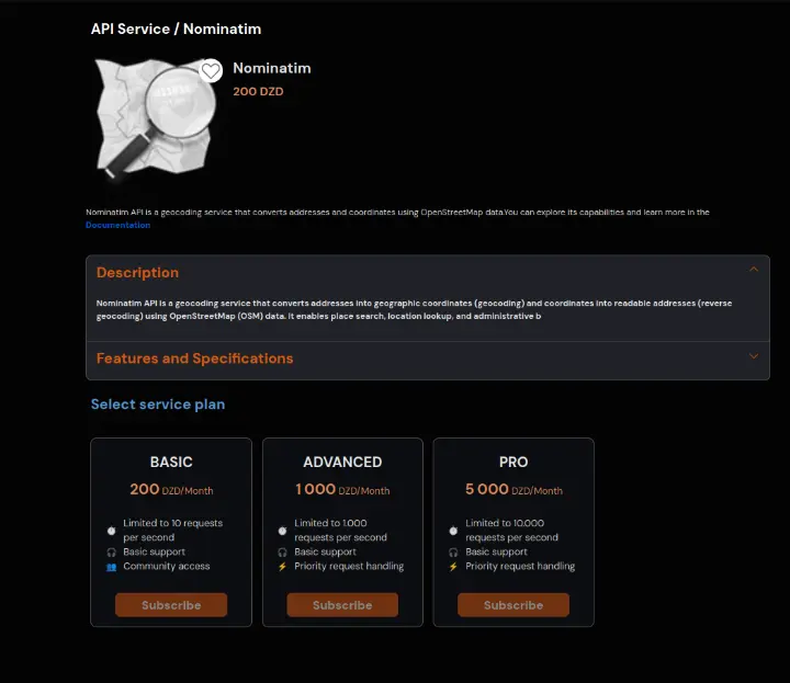Click on Nominatim API to see the details. Then choose a pricing plan