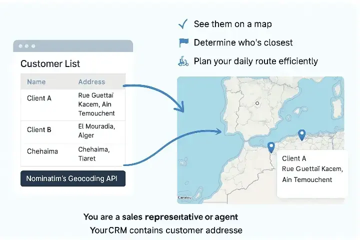 Instead of manually entering coordinates for each address, you use Nominatim’s geocoding API to automatically convert customer addresses into latitude and longitude. The coordinates are then used to: